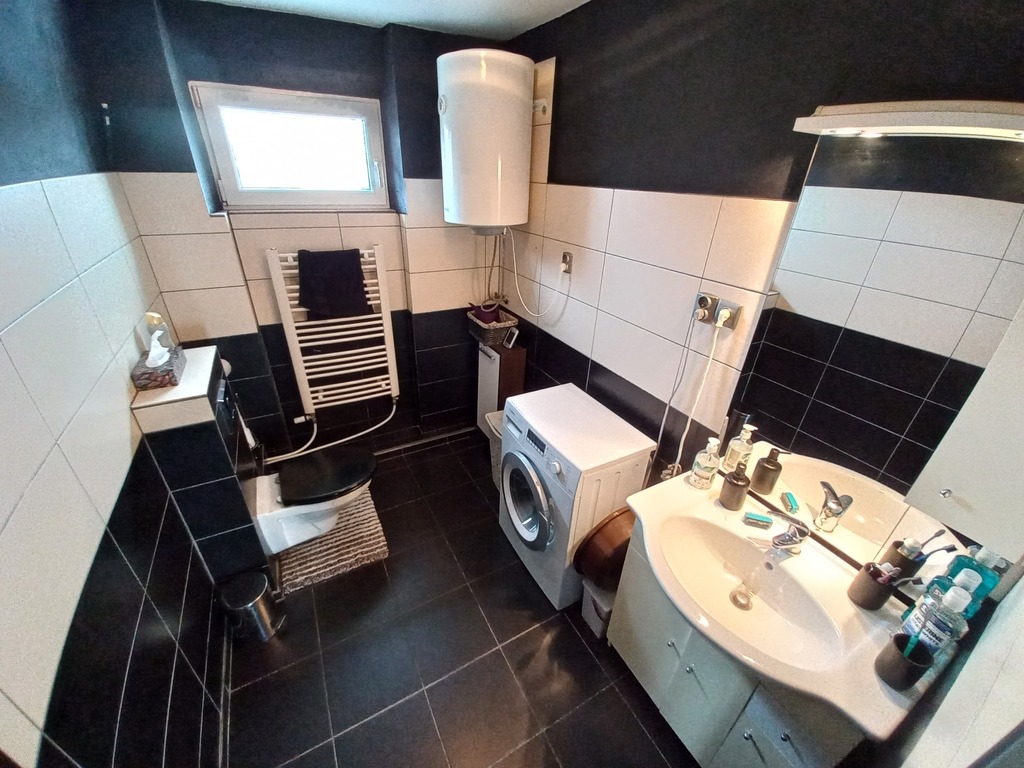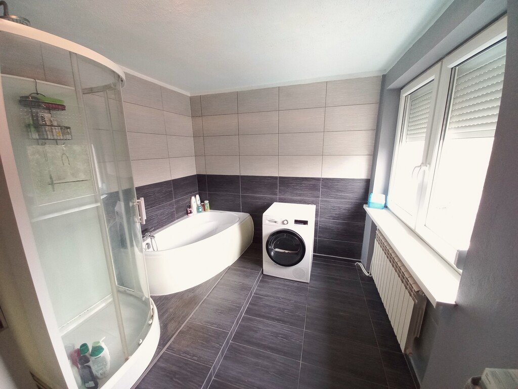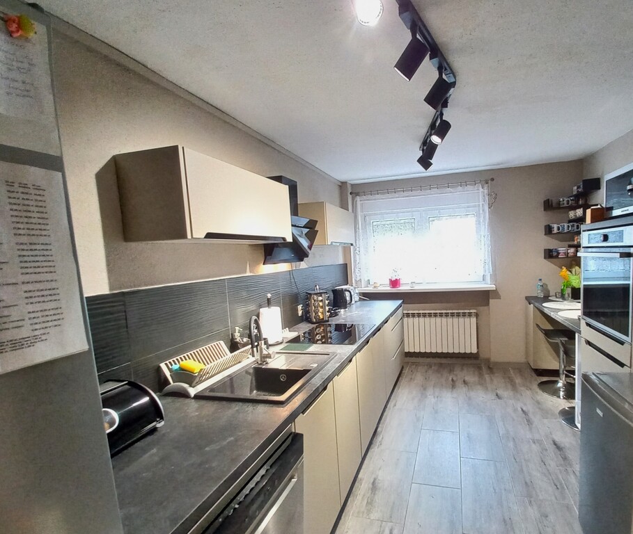 Dom o klasycznej bryle z płaskim dachem przeszedł termomodernizację, co zapewnia lepszą efektywność cieplną, a także został wyposażony w nowoczesną pompę ciepła, dzięki czemu koszty ogrzewania są niższe. Na parterze znajduje się umeblowana kuchnia, przestronny salon, przedpokój, pomieszczenie gospodarcze oraz garaż w bryle budynku. Na piętrze mieszczą się trzy ustawne pokoje oraz duża łazienka z oknem, wyposażona zarówno w wannę, jak i prysznic oraz osobne WC.